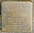 Anoni Midinski wurde am 13. Juli 1898 in Werbowics bei Kamjanez-Podilskyj in der Westukraine geboren. Später war er eine von rund 2,75 Mio. Zivilpersonen, die aus der Sowjetunion zur Arbeit nach Deutschland verschleppt wurden. Er kam nach Tuttlingen und lebte im Kriegsgefangenenlager „Mühlau“. Wegen angeblicher Arbeitsverweigerung wurde Midinski inhaftiert und starb an den Verletzungen, die ihm ein Gefängniswärter beigebracht hatte.[19] |