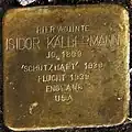 HIER WOHNTE ISIDOR KÄLBERMANN JG. 1899 'SCHUTZHAFT' 1938 FLUCHT 1939 ENGLAND USA |
