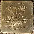 HIER WOHNTE GUSTAV ADOLF HILZINGER JG. 1886 EINGEWIESEN 1925 HEILANSTALT GÖTTELFINGEN 'VERLEGT' 22.4.1941 HADAMAR ERMORDET 22.4.1941 'AKTION T4' |