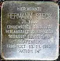 HIER WOHNTE HERMANN STECK JG. 1900 EINGEWIESEN 15.3.1932 HEILANSTALT ZWIEFALTEN 'VERLEGT' 13.11.1940 GRAFENECK ERMORDET 13.11.1940 'AKTION T4' |