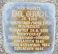 HIER WOHNTE EMIL GERACH JG. 1898 IM WIDERSTAND / ROTE HILFE DENUNZIERT VERHAFTET 28.9.1938 'HOCHVERRAT' BRANDENBURG-GÖRDEN ENTLASSEN 1940 'AKTION GITTER' AUG. 1944 ENTLASSEN 1944 |