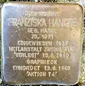 HIER WOHNTE FRANZISKA HANDTE GEB. HASEL JG. 1871 EINGEWIESEN 1937 HEILANSTALT ZWIEFALTEN 'VERLEGT' 13.8.1940 GRAFENECK ERMORDET 13.8.1940 'AKTION T4' |