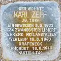 HIER WOHNTE KARL ZEPF JG. 1899 EINGEWIESEN 5.5.1933 1934 ZWANGSSTERILISATION MEHRERE HEILANSTALTEN VERLEGT 18.6.1940 GRAFENECK ERMORDET 18.6.1940 'AKTION T4' |