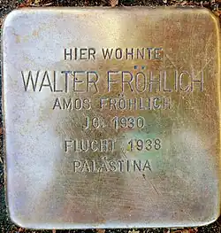 HIER WOHNTE WALTER FRÖHLICH AMOS FRÖHLICH JG. 1930 FLUCHT 1938 PALÄSTINA |