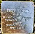 HIER WOHNTE JOSEF BERGER JG. 1876 ALS ASOZIAL STIGMATISIERT VERHAFTET 27.6.1938 DACHAU ERMORDET 5.1.1940 MAUTHAUSEN |