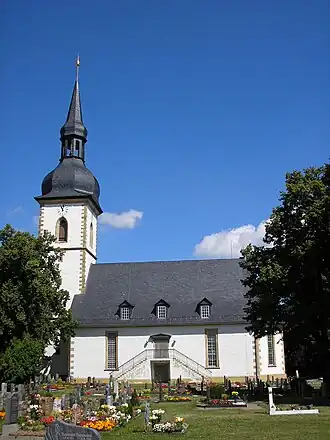 - Kirchhof mit historischen Grabsteinen und dem Gemeinschaftsgrab für 13 Soldaten der Wehrmacht, die am 11. April 1945 bei der amerikanischen Besetzung des Ortes erschossen worden sind: ein „unaufgeklärtes Ereignis“. Es handelte sich um zwei Unteroffiziere und Mannschaftsdienstgrade unterschiedlicher Einheiten, drei Soldaten waren namentlich unbekannt.[11]