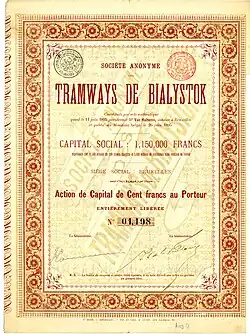 Die Finanzierung erfolgte durch die belgische Société Anonyme des Tramways de Bialystok, die mit einem Aktienkapital von 115 Mio. Belgischer Franken versehen war, das in Aktien zu 100 Belgischen Franke gezeichnet wurde, die in Brüssel gehandelt wurden.[1] Der Vertrag mit der Stadt sah vor, dass die Straßenbahn nach 40 Jahren Betrieb Eigentum der Stadt werden sollte. Dazu kam es nicht weil der Betrieb mit den Einmarsch der Deutschen Armee im Zusammenhang mit den Kriegshandlungen des Ersten Weltkriegs im September 1915 endete.[2]