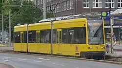 - Im Farbschema der Bahnen finden sich seit Mitte der 1970er Jahre die Farben gelb und blau (Stadtfarben) in verschiedenen Versionen wieder. Von 1998 bis 2011 sah das Erscheinungsbild eine ginstergelbe Grundlackierung mit blauen „Powerstrips“ an der Dachkante und ebenfalls blauen Beschriftungen vor, auch bei Omnibussen. Ab 2011 sah man bei Neuanschaffungen von den Powerstrips ab, der Gelbton wurde auf Rapsgelb (RAL 1021) und der Blauton auf Ultramarin (RAL 5002) umgestellt.[29]