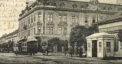 Ferner baute die Straßenbahngesellschaft parallel zur Elektrifizierung zwei Streckenabschnitte der Pferdebahn zweigleisig aus. Hierbei handelte es sich um den 1280 Meter langen Abschnitt zwischen der Piața Romanilor – wo sich damals auch eine Haltestelle befand – und der Piața Balaș beim heutigen Hotel Continental sowie um das 1088 Meter lange Teilstück zwischen dem Opernhaus und der Piața Alexandru Mocioni.[9] Hierbei mussten auch die massiven Festungsmauern der Stadt durchbrochen werden, weil die beiden Bahnfestungstore nur für eine eingleisige Trassierung ausgelegt waren. Jedoch war die 1891 begonnene Entfestigung bereits in vollem Gang, das heißt, das bis 1910 gänzlich abgetragene Bollwerk war damals bereits nicht mehr intakt.[12] Die beiden zusammen circa 2,4 Kilometer langen Doppelspurinseln waren dabei auch die einzigen Abschnitte der Pferdebahnstrecke, welche die Gesellschaft direkt umstellte. Von Vorteil war hierbei, dass kein Gleis – die elektrische Straßenbahn benötigte einen stärkeren Unterbau und schwerere Schienen – unter laufendem Betrieb umgebaut werden musste. Dies konnte vermieden werden, indem erst das neue zweite Gleis in Betrieb ging und anschließend das alte Pferdebahngleis ausgetauscht werden konnte. Nicht zuletzt aus diesem Grund verkehrte die elektrische Straßenbahn zwischen Piața Alexandru Mocioni und Strada Iancu Văcărescu auf der anderen Straßenseite als die Pferdebahn.