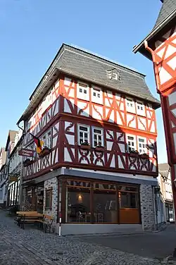 Das Fachwerkhaus ist über quadratischem Grundriss errichtet. Das ursprüngliche Erdgeschoss ist durch Veränderungen im 20. Jahrhundert nicht mehr zu erkennen. Die Obergeschosse sind unverändert mit einem regelmäßigen, symmetrischen Aufbau versehen. Zwischen den Mannfiguren sind die Fenster paarweise gruppiert. Im ersten Obergeschoss sind Feuerböcke in den Brüstungsgefachen und geschweifte Kopfstreben vorhanden, das zweite Obergeschoss ist einfacher gestaltet.