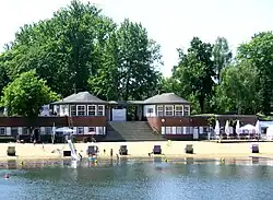 Für den Bau des künstlichen Sandstrandes wurden mehrere Meter der hohen Uferböschung abgetragen und der neue Strand mit einer etwa 250 Meter langen, zum See sich öffnenden u-förmigen Stützmauer eingefasst. In der Mitte des annähernd symmetrischen Aufbaus führt eine breite Treppe aus Granit hinauf auf das alte Uferniveau. Zu beiden Seiten der Treppe wurden vorgewölbte Gebäude mit Fassaden aus rotem Ullendorfer Verblendstein[13] und schiefergedeckten Kegeldächern errichtet und mit Sanitäranlagen und Gastronomieräumen ausgestattet. Die geschwungene Stützmauer, oderhalb derer Terrassen liegen, endet zu beiden Seiten mit einem zweigeschossigen, schiefergedeckten Pavillon. 1929 lobte die Fachpresse den „Wassersportplatz am Plötzensee“ als „eine in schönster landschaftlicher Umgebung liegende, geschmackvolle Anlage.“[14]