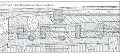 Grundlegende stratigraphische Einheit in Geologie und Archäologie ist die Schicht, stratum. Im archäologischen Kontext wird das anthropogene Wirken und damit die Unterscheidung zwischen einer natürlichen, natural layer, und einer anthropogenen Schicht, cultural layer, zentral. Obgleich die anthropogenen Schichten in der Archäologie im Fokus des Interesses stehen, müssen auch die natürlichen Schichten in der Auswertung einbezogen werden, da sie wichtige Informationen beitragen. Aber nicht nur Straten in der Horizontalen, sondern auch vertikale Straten sind von Wichtigkeit, etwa Mauern, Gruben, Gräben, Pfostengruben etc. Edward. C. Harris (1989)[4] benutzte den Begriff upstanding layer. Eine weitere von Harris benannte Gruppe wird mit dem Begriff interfaces oder Grenzebenen bzw. -flächen charakterisiert. Bei natürlichen und anthropogenen Straten, aber auch den upstanding layers oder aufgehenden Befunden sind deren Oberflächen mit den Grenzebenen identisch.[5]