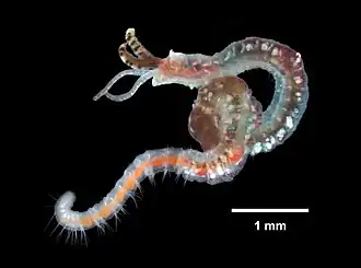 Mit seinen beiden Palpen sammelt Streblospio benedicti Nahrungspartikel aus Schlamm und Detritus von der Substratoberfläche ein und befördert sie zum Mund.