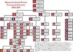 Die Streitkräfte bestehen aus dem Heer (Tatmadaw Kyi တပ်မတော် ကြည်း), den Luftstreitkräften (Tatmadaw Lay တပ်မတော် လေ) und der Marine (Tatmadaw Yay တပ်မတော် ရေ). Sie verfügen nach offiziellen Angaben über etwa 400.000 Soldaten (360.000 im Heer, 20.000 in der Luftwaffe und 20.000 in der Marine). Einige Analysten gehen aber von viel geringeren Zahlen aus. So schätzte das United States Institute for Peace, dass die Armee 2023 nur über 150.000 Mannschaften verfügte. Von diesen wären nur 75.000 wirkliche Einsatztruppen.[7][8] Parallel hierzu existieren noch der Grenzschutz und eine Volksmiliz. Die Polizei (siehe auch: Border Guard Police) untersteht dem Innenministerium, das der Armee jedoch nachgeordnet ist.[4]