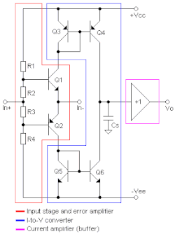 Der prinzipielle interne Aufbau des stromrückgekoppelten Operationsverstärkers lässt sich in drei Abschnitte einteilen: