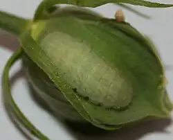 Der Körper der Raupe ist in der Regel grün. Es existieren aber auch Farbvariationen von hellgrün, gelbgrün und violett oder je nach Futterpflanze, passend zur Farbe der Blüten oder Blätter. Bei allen Farbvariationen sind die weißen seitlichen, schräg verlaufenden diagonalen Balken auf jedem Segment gleich. Ihr Körper ähnelt ein wenige einer Laus und hat borstige Lappen unterhalb der einzelnen Körpersegmente.[2] In Texas scheinen die Raupen mit kurzen Haaren bedeckt zu sein.[1]