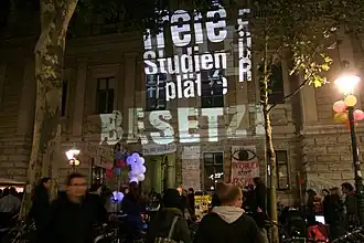 Im Zuge von Studentenprotesten in Österreich gegen Beschränkungen des Hochschulzuganges wurden ab Ende Oktober 2009 an vielen österreichischen Universitäten Hörsäle und weitere Räumlichkeiten besetzt, darunter die beiden größten Hörsäle Österreichs an der Universität Wien, sowie der größte Hörsaal der Universität Graz. Die Proteste stellten die größten Bildungsproteste der letzten Jahre in Österreich dar, wurden in der internationalen Presse wahrgenommen[1] und führten innerhalb Österreichs zu einer breiten Diskussion über die Bildungspolitik.