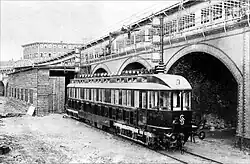 Der Siemens-Schnellbahnwagen wurde unter der Verantwortung von Walter Reichel entwickelt. Er besaß an beiden Wagenenden einen Mast mit je drei Stromabnehmern. Außen waren Widerstandssegmente aus dem Werkstoff Kruppin angebracht, der einen besonders hohen elektrischen Widerstand aufweist.[26] Der Wagen wurde im Jahr 1901 zum Berliner Hochbahn-Gleisdreieck, das damals noch im Bau war, angeliefert. Dort gab es einen provisorischen Holzschuppen unmittelbar westlich des Hochbahnviadukts, in dem die elektrische Ausrüstung eingebaut werden konnte. Durch das in unmittelbarer Nähe befindliche Siemens-Hochbahnkraftwerk waren hier erste Tests der elektrischen Ausrüstung möglich.