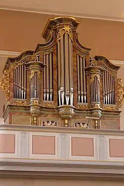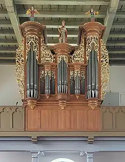 1737 Neubau durch Johann Michael Stumm, 1782 Umbauten durch Johann Nikolaus Stumm oder Johann Friedrich Stumm, von Gustav Stumm 1904 radikal umgebaut; von der ersten Orgel ist noch das Obergehäuse mit seinen für Johann Michael Stumm charakteristischen Rundtürmen und dem reichen Akanthus-Schnitzwerk erhalten.[15] Wesentliche Teile der Register Hohlpfeif, Principal, Flöt, Quint, Octav und Mixtur gehen ebenfalls auf Johann Michael Stumm zurück. | ||