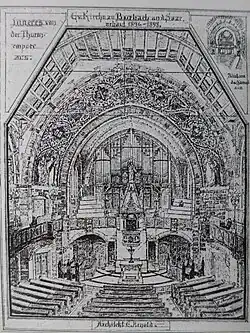 Nach verschiedenen Überarbeitungen im 19. Jahrhundert erfolgte 1895 Neubau durch Heinrich Voltmann; Reste des Stumm-Prospektes erhalten[36] | ||