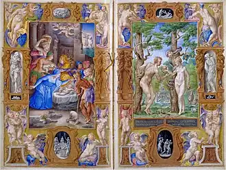 Die beiden gegenübergestellten Miniaturen befinden sich in einem architektonischen Rahmen, der vollgepackt ist mit Aktfiguren in mit Michelangelo vergleichbarer Haltung, deren weiße Körper mit den bronzierten Atlanten als Sockelträger kontrastieren, auf denen sie stehen. Die Hirten, die im Gegensatz zu den reichen Geschenken Gold, Myrrhe und Weihrauch der drei Könige nur bescheidene Schafe als Geschenke mitbringen, stellen eine meisterhafte Gruppe dar. Im Gegensatz hierzu enthält das Bild auf der gegenüberliegenden Seite nur zwei Figuren, die völlig nackten Gestalten von Adam und Eva in jenem Augenblick, bevor ihnen die Augen geöffnet wurden und sie hastig ihre Blößen mit Feigenblättern bedeckten.