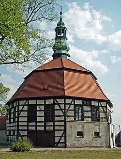- Die katholische Kirche der hll. Peter und Paul (Kościól ŚŚ Piotra i Pawła) wurde 1731–1734 in Fachwerk-Bauweise an der Stelle mehrerer Vorgängerbauten errichtet. Der Glockenturm entstand 1837.