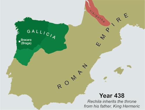 Am 31. Dezember 406 überquerte ein Stamm bzw. Kriegerverband mit Namen Suebi, begleitet unter anderem von Vandalen und Alanen, den Rhein bei Mogontiacum (Mainz) (Rheinübergang von 406). Die Krieger plünderten zunächst Gallien und drangen dann 409 nach Hispanien vor. Hier wurde ihnen angeblich durch das Los die Provinz Gallaecia zugeteilt. In Braga (lateinisch Bracara) errichteten sie ihre erste Residenz. Nachdem sie auch den nördlich gelegenen Siedlungsbereich der vandalischen Hasdingen in Galicien übernommen hatten, wurde in A Coruña (lat. Corunium) mit dem Flavium Brigantium eine zweite Residenz eingerichtet. Über die genaue Herkunft dieser suebischen Gruppe, die 585 von den Westgoten endgültig unterworfen wurde, kann nur spekuliert werden. Am ehesten kommen die Donausueben bzw. Quaden in Betracht. Das Suebenreich in Galicien kooperierte geschickt abwechselnd mit Westgoten und dem Weströmischen Reich, wobei es sich jeweils an den aktuell Stärkeren hielt und die Unabhängigkeit oft durch Heiratspolitik erhielt. Es als gotischen Vasallen zu betrachten, wäre daher zu kurz gedacht.
