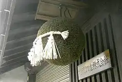 Es handelt sich um Zweige der Sicheltanne (sugi), die zusammengebunden und in Kugelform geschnitten werden. Diese Kugeln werden über dem Eingang zur Brauerei gehängt, wenn neuer Sake angesetzt wird. Die braune Verfärbung der Blätter signalisiert, dass der angesetzte Sake trinkfertig gereift ist.