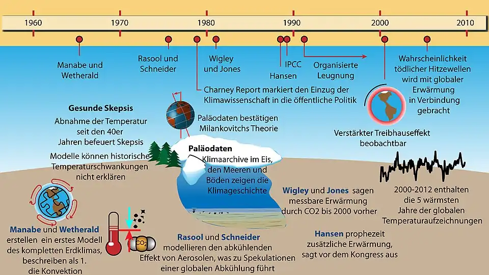 Die systematische Erforschung von natürlichen Klimawechseln begann in der ersten Hälfte des 19. Jahrhunderts mit der allmählichen Rekonstruktion der Eiszeit-Zyklen und anderen klimatisch bedingten Umweltveränderungen im Rahmen der Paläoklimatologie und der Quartärforschung. Bereits Ende des 19. Jahrhunderts wurden menschliche Einflüsse auf das Erdklimasystem über Treibhausgase vermutet, entsprechende Berechnungen wurden aber bis in die 1960er Jahre hinein stark angezweifelt. Detaillierte Darstellungen zur Forschungsgeschichte des Klimawandels, insbesondere zu der im Laufe des 20. Jahrhunderts feststellbaren anthropogenen Klimaveränderung, finden sich beispielsweise im 1. Kapitel des Vierten Sachstandsberichts des IPCC[1] und ausführlicher bei dem US-amerikanischen Physiker und Wissenschaftshistoriker Spencer R. Weart.[2] Eine auf der Arbeit von Spencer Weart basierende deutschsprachige Ausarbeitung findet sich auf der Homepage von Skeptical Science.[3]