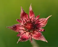 Der Blütenstand wird als locker trugdoldig bezeichnet. Die zwittrigen, radiärsymmetrischen Blüten sind meist fünfzählig, selten siebenzählig. Die grünen, schmal-lanzettlichen Außenkelchblätter sind halb so lang wie die breit-lanzettlichen, zugespitzten Kelchblätter. Die fünf oberseits dunkel-rotbraunen, zusammenneigenden Kelchblätter sind doppelt so lang wie die Kronblätter, sie vergrößern sich bis zur Fruchtreife. Die fünf purpurfarbenen Kronblätter sind 3 bis 8 Millimeter lang und schmal.[2] Die 20 Staubblätter sind schwarz-purpurfarben. Die Blütezeit liegt zwischen Juni und Juli (August).