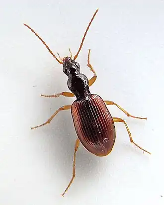 Der Halsschild ist sehr schlank herzförmig, die Krümmung nach innen beginnt schon weit vor der Basis, die größte Breite wird schon beim ersten Drittel erreicht. Die Basis ist geradlinig. Besonders zu den Seiten hin ist sie sehr prägnant punktiert, die Hinterwinkel sind zugespitzt. Der Halsschild trägt ebenfalls vier Borstenhaare. Je eines sitzt an den Hinterecken, je eines direkt über dem Seitenrand etwa an der breitesten Stelle des Halsschilds.