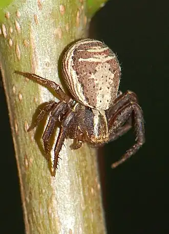 Der Vorderkörper (Prosoma) des Weibchens ist oberseits seitlich dunkelbraun, in der Mitte befindet sich ein breites, hell bräunliches bis blassgelbes Längsband, das einen vorne breiten und nach hinten spitz zulaufenden, also etwa V-förmigen, braunen Fleck umrandet. Der Hinterkörper (Opisthosoma) zeigt auf ebenfalls hellerem Grund eine bräunliche vorne unterbrochene Blattzeichnung und auf dieser hinten drei helle Querbänder. Die Beine sind recht einfarbig hellbeige bis braun und intensiv fein dunkel gefleckt.