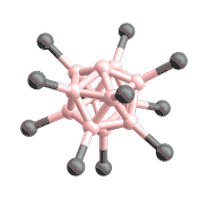 Die closo-Dodecaborat-Dianionen, die dabei als Vorläufer (Präkursoren) dienen, bestehen aus zwölf Boratomen, die in einer hochsymmetrischen, käfigartigen closo-Struktur angeordnet sind. Alle zwölf Boratome tragen einen Substituenten, (z. B. ein Halogenatom), welche gemeinsam die Außenhülle des Ions formen (vgl. Abb. 3).