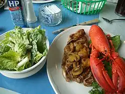 Das Gericht ist verbreitet in Nordamerika. Die US-amerikanische Restaurantkette Steak and Ale führte es unter der Bezeichnung Steak and Tail. In den US-amerikanischen Streitkräften gilt es auch als Deployment Meal (Deutsch etwa „Aufmarsch/Entsendungs-Essen“), also als luxuriöses Mahl vor der Entsendung in den Kampfeinsatz, jedoch wird die Kombination nicht ausschließlich vor Kampfeinsätzen verteilt.[2][3][4]