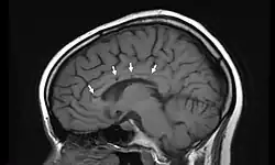 Kognitive Störungen sind Veränderungen des Denkens, die bis zu einer Psychose reichen können. Häufig tritt begleitend starker Kopfschmerz auf, der den weiteren Symptomen vorausgehen kann. In der obligaten Magnetresonanztomografie bestehen nahezu immer typische Defekte im Balken.[5] Dort findet man Veränderungen typischerweise im Bereich der zentralen Bahnen mit relativer Aussparung der Balkenperipherie. Weitere Gehirnareale können befallen sein.