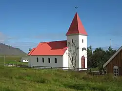 Die 1927 erbaute Kálfafellsstaðarkirkja auf dem Hof Kálfafellsstaður an der Ringstraße im Westen der Gemeinde hat ebenfalls einen massiven, weithin sichtbaren Turm.[9] Bereits vor der Reformation stand hier eine Kirche, die dem hl. Olaf von Norwegen geweiht war.