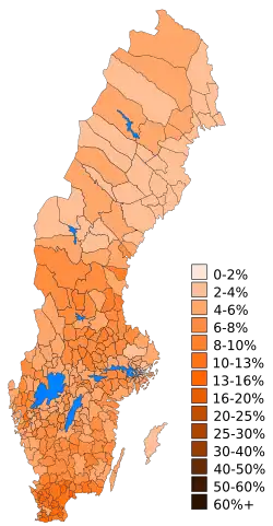 In etwa 30 Wahlkreisen in Südschweden, vor allem in der südschwedischen Provinz Skåne län, erhielt die SD prozentual die meisten Stimmen:
