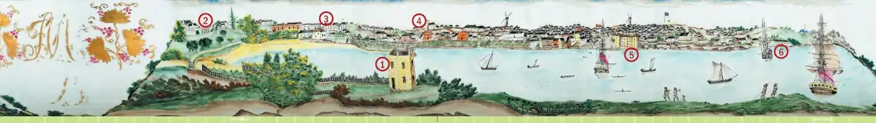 Am Westufer ist der Rocks-Distrikt zu sehen mit zwei Windmühlen auf dem Bergkamm. Bekannt als Tallawoladah bei dem Cadigalstamm, beheimatete Rocks die Strafgefangenen der Stadt. Sie bauten traditionelle Häuser, zuerst aus Flechtwerk und Lehm mit Strohdächern, später mit Wetterschenkeln oder Bruchstein, überdacht mit Holzschindeln. Sie nahmen Untermieter – die neu eingetroffenen Strafgefangenen – die in Küchen und Skillions schliefen. Einige Emancipisten hielten sich auch Sträflinge als Diener. Nach November 1790 kam eine große Anzahl von Aborigines in die Stadt zu Besuch und um dort zu leben. 1823 lebten etwa 1200 Menschen in The Rocks, die meisten von ihnen waren Emanzipisten und Sträflinge, und ihre Kinder.[38]