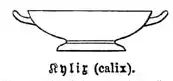 Das rituelle Trinkgeschirr bestand aus Trinkgefäßen Kylix, dem Mischgefäß Kratér und dem Kühler Psykter. Das Gefäß, aus dem der Wein (Oinos) entnommen wurde, war die Oinochoe, sein Pendant für Wasser die Hydria.