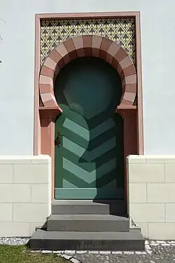 Über einem rechteckigen Grundriss erhebt sich ein zweigeschossiger Bau, der von einem Satteldach gedeckt wird. Die beiden gestuften Giebel sind Stilelemente der Gotik. Die drei Portale der Westfassade besitzen Hufeisenbögen und ägyptisch anmutende Palmettenkapitelle. Die Giebelabschlüsse bestehen im Westen aus den Gesetzestafeln und im Osten aus der Ehernen Schlange.