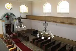 Der schlichte Innenraum ist hell verputzt. Neben der Rundbogennische mit dem Toraschrein befindet sich in halber Höhe eine hölzerne Kanzel mit Schalldeckel.