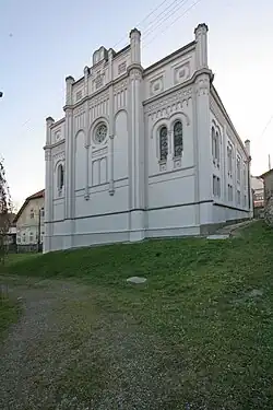 Die neue Synagoge im neuromanischen Stil, mit orientalisierenden Elementen versehen, ersetzte eine ältere Synagoge an gleicher Stelle, die einem Brand zum Opfer gefallen war. Sie wurde nach den Plänen der Architekten František Skřivánek und J. Spidil erbaut.