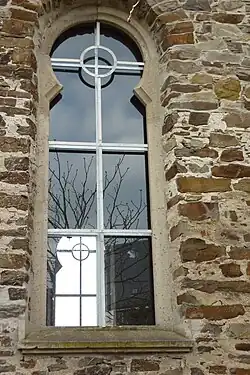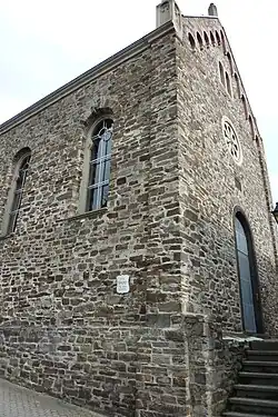 Der Bruchsteinbau erhebt sich auf einem niedrigen dem Straßenniveau folgenden Sockel und der Eingang ist über acht Stufen erreichbar. Die Portalfassade wird von Ecklisenen und einem Treppenfries gerahmt. Der Giebel wird von erneuerten fialenartigen Aufsätzen bekrönt. Zwischen dem rundbogigen Portal und der Rosette befindet sich eine Inschriftentafel und im Giebelfeld ist ein Zwillingsfenster.