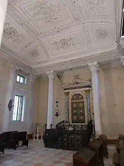 Die Bima steht direkt vor dem Thoraschrein, wie es für sephardische Synagogen Tradition ist, und wird von einer schmiedeeisernen Absperrung begrenzt. Den Thoraschrein schmücken zwei Säulen, auf denen ein Dreiecksgiebel mit Akroterien ruht.