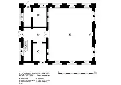 Vom Eingang im Westen gelangte man durch einen Raum zum Gebetssaal; rechts und links davon waren weitere Räume sowie eine Treppe zur Frauenempore.