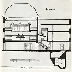 Die neue Synagoge war kein freistehendes Gebäude, sondern reihte sich in die Straßenfront von mehreren Wohnhäusern ein. Ihr Aussehen ist lediglich auf der Basis von Beschreibungen von Ernst Simons, Sohn des letzten Rabbis Julius Simons, bekannt.[32] Demnach reichte die Synagoge selbst vom ersten bis in den zweiten Stock und umfasste 240 Plätze für Männer und auf einer Empore im zweiten Stock 200 Plätze für Frauen. Auf einer Erhöhung stand der Toraschrein. Im Erdgeschoss befand sich eine Religionsschule für 50 Kinder und ein Gemeindesaal für 100 Personen; ein weiterer Raum diente als Sitzungszimmer und Bibliothek. In der dritten Etage wohnte die Familie Simons. Den über Jahrhunderte tradierten Schatz an rituellen Objekten und Teile der Inneneinrichtung hatte die Gemeinde 1915 in den Neubau mitgenommen.[33] So hatten sich zahlreiche Textilien angesammelt, wie Simons berichtete: „Mir ist bekannt, dass an jedem Neumond und an jedem Feiertag die Vorhänge und dazu gleichzeitig die Decken des Vorbeter- und Vorlesepultest eine andere Farbe hatten. Ich würde die Zahl der Vorhänge auf ca. 15–20 schätzen […] Die Zahl der Thoramäntelchen schätze ich auf ca. 100. […] Die Laubhütte fasste 60 Personen. […] Von der Decke der Synagoge hingen 4–6 Kronleuchter.“[32]