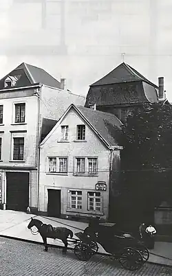 1884 wurde das Hotel „Prinz Carl“ abgerissen, die Synagoge verschwand aber bald hinter einem Eisenbahndamm und einem Viadukt über die Freiheitstraße (den Deutzern wiederum wurde die Sicht auf den Dom versperrt).[24][25] Zu dieser Zeit waren auf dem Dach – wie auf dem Aquarell von Scheiner zu sehen – zwei Davidsterne montiert, von denen 1914 nur noch einer erhalten war (der sich heute im Kölnischen Stadtmuseum befindet).[26] (=Ungefähre Lage der zweiten Synagoge 1786–1913)