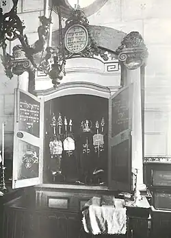 „Zwischen den beiden östlich gelegenen [Fenstern] war der Thoraschrein, Aron ha-Kodesch (Schrein des Heiligtums) angeordnet, ein in das Mauerwerk teilweise eingelassener, durch Flügeltüren verschließbarer Schrank zur Aufnahme der Thorarollen. Im Äußeren umgab ihn […] eine portalartige Architektur mit kräftigem Säulenpaar, das Blumenkörbe trug, und deren mittlere Bekrönung, eine von Laubwerk umrankte Kartusche bildet mit der hebräischen Inschrift: ‚Bedenke vor wem du stehst, vor Gott, dem Könige aller Könige, gepriesen sei sein Name.‘ Vor dem Thoraschrein hing eine Ampel mit dem Ewigen Licht (Ner Tamid); seitlich auf brüstungsartigen Schranken hatten die verschiedenen Leuchter ihren Platze, darunter der beim Tempelweihfest, gebrauchte achtarmige Chanukka-Leuchter. In der Mitte der Synagoge erhob sich als einer der wichtigsten Bestandteile der Almemor, ein um Stufen erhöhtes […] Podium mit großem Lesepult, das, belegt von schönen Decken, zur Ausbreitung der entkleideten Thorarollen diente.“