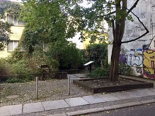 Am 5. März 2006 wurde anlässlich des 100. Jahrestages der Synagogenweihung am 4. März 1906 vom Berliner Senat und dem Bezirksamt Mitte ein Gedenkort auf dem Grundstück präsentiert. Das Ensemble besteht aus Gedenktafel (Pulttafel mit Inschrift und in Ätztechnik eingearbeiteten Abbildungen), einer Sitzbank und einem 5 m hohen Wandbild an der Brandmauer des Nachbargrundstücks.[8] Stadtentwicklungssenatorin Ingeborg Junge-Reyer sagte bei der Eröffnung: „Es ist gut und richtig, dass auch an diesem Ort das Gedenken an die große Vielfalt, die hier einmal herrschte, und an deren grausame Zerstörung möglich wird. Die Gestaltung des Gedenkortes zeigt, dass die Projekte der Stadterneuerung über den bloßen Aspekt der Stadtreparatur hinaus auch dem Erhalt eines ungewöhnlich kulturell geprägten Teils des alten Berlin dienen. Die auf der Wand dargestellte Bauentwurfszeichnung als zusammengeknülltes und abgebranntes Papier thematisiert eindrucksvoll die Zerstörung des Gebäudes in der sogenannten Reichskristallnacht. Die anspruchsvolle Gestaltung wird sicher dazu beitragen, das Interesse des Betrachters zu wecken und damit zum Nachdenken anregen.“