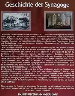 1. a b c 150 Jahre Synagoge Kobersdorf. Archiviert vom Original (nicht mehr online verfügbar) am 29. Dezember 2014; abgerufen am 30. April 2015.  Info: Der Archivlink wurde automatisch eingesetzt und noch nicht geprüft. Bitte prüfe Original- und Archivlink gemäß Anleitung und entferne dann diesen Hinweis.@1@2Vorlage:Webachiv/IABot/www.davidkultur.at